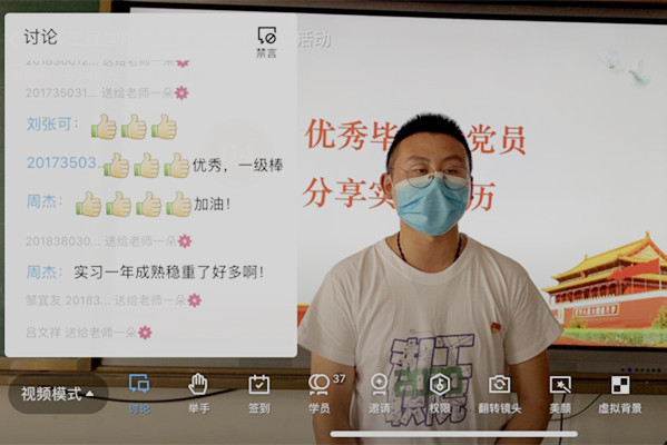 新闻网讯(通讯员 玉声)“当企业加紧生产要求连上两班时,有的人坚持不了选择离开,我也有想打退堂鼓的念头,但想到作为一名共产党员应当迎难而上,于是咬咬牙就坚持了下来……”,在东风小康实习的毕业生党员田金超与大家分享实习经历时感慨地说。6月19日下午,pg国际电子网站学生党支部通过腾讯课堂直播开展了一场别开生面的“线上+线下”主题党日活动。pg国际电子网站学生党支部书记曲杉主持此次主题党日活动。党总支书记张玲、副书记梁军萍、学生党小组组长柳海涛以及毕业生党员代表在5307参会,37名非毕业生班学生党员和入党积极分子以观看直播方式参加活动。